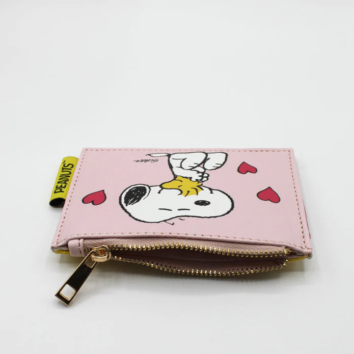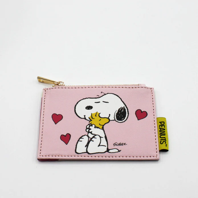 Smidig plånbok i fint motiv. Framsida med Snobben och Woodstock som kramas. Baksida med fyra fickor för kort, och texten ”Love” samt fack med dragkedja och plats för sedlar och mynt.