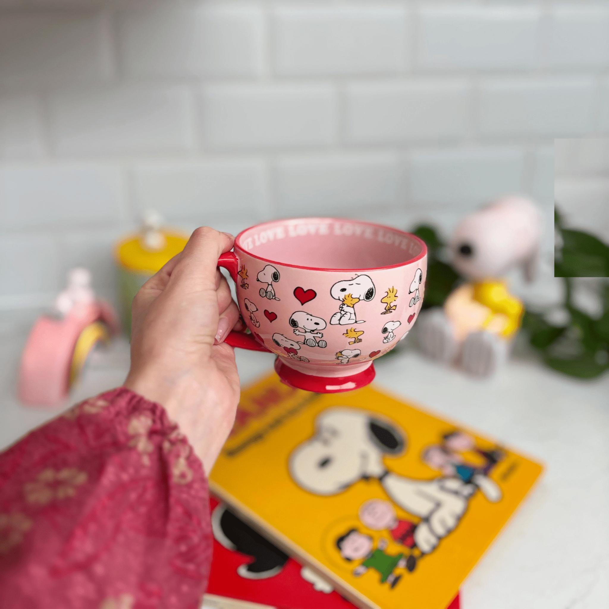 Men så söt! Rosa mugg med Snobben i 3D som sitter på muggens botten. Rosa utsida med Snobben, Woodstock och hjärtan, rött öra. Rosa insida med texten ”Love” i övre kanten.