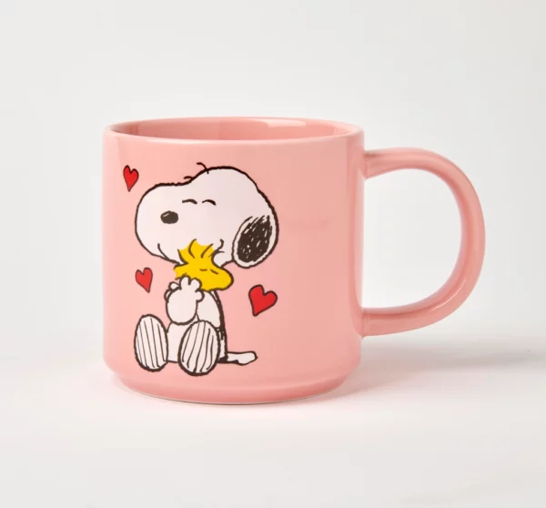Mugg med Snobben i härligt rosa färg och kärleksfullt motiv som levereras i fin presentask. Här ses Snobben och Woodstock kramas, på muggens andra sida ses Woodstock kvittra en kärlekssång.