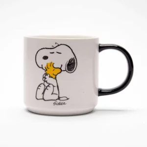 Underbar mugg att ge bort eller för att bli på gott humör av då det är dags för fika. Mugg där Snobben och Woodstock kramas och text på baksidan ”Love” tillsammans med två röda hjärtan.