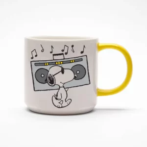 Cool mugg med Snobben som lyssnar på musik. Text på baksidan ”Music is life”. Vit mugg med gult öra och presentask.