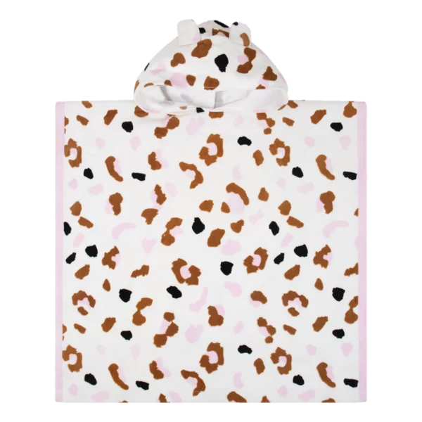Tuff och praktisk strandponcho barn – Leopard, mäter 65 x 65 cm. Perfekt badponcho med huva och söta öron, för strand och bad, att mysa i efter badet och att byta om under.