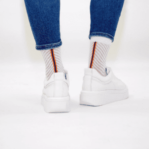 Tunna stumpor i vitt med röd rand baktill. Skira strumpor med ränder i genomskinligt vitt. Högkvalitativ strumpa med förstärkt häl och tå, som med fördel tvättas i tvättpåse för ändå längre livslängd. Storlek 36-40. Passar bra både till sneakers och klack och är gjorda för att synas!