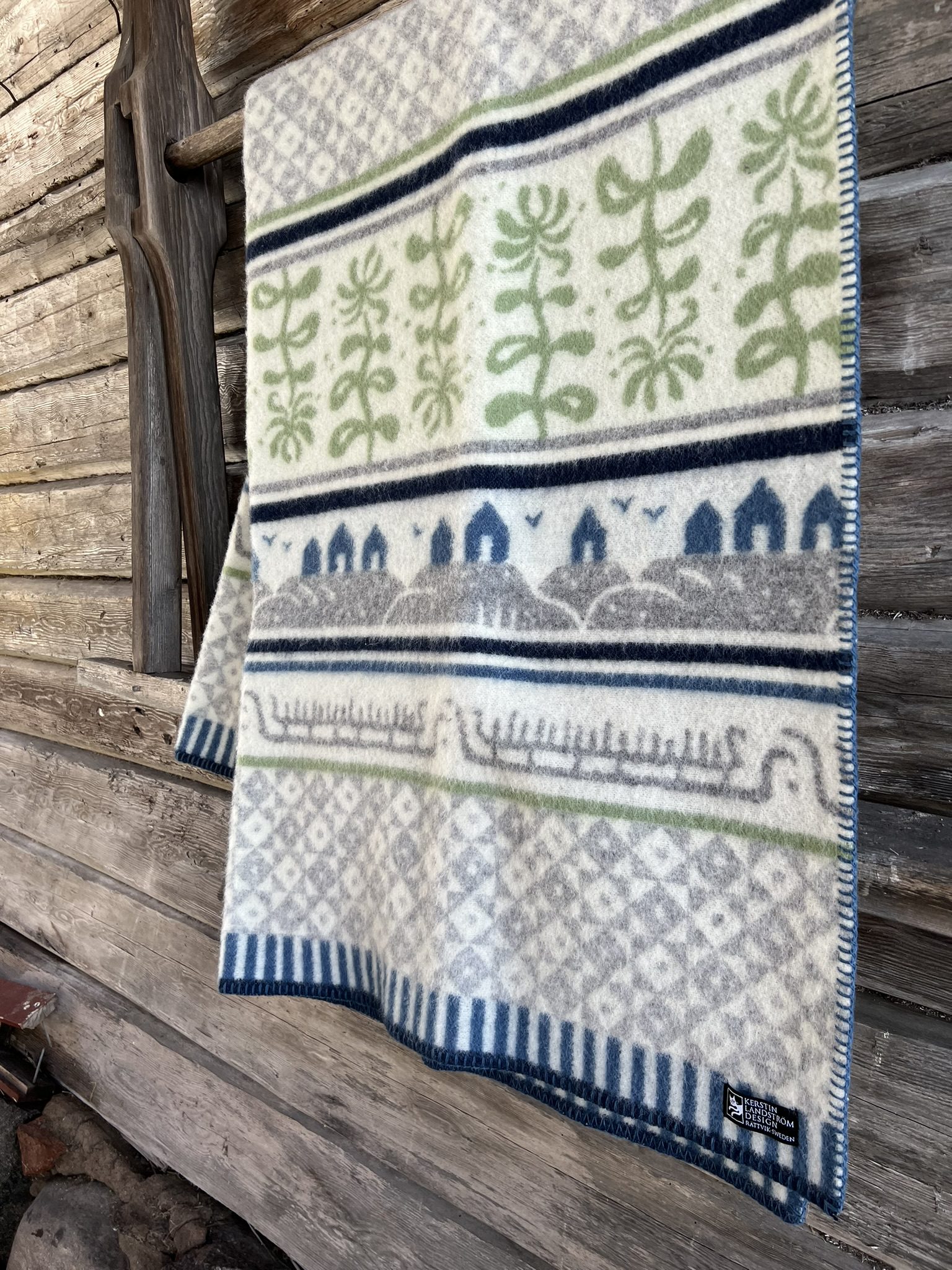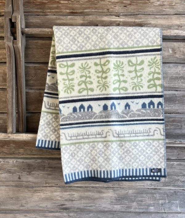 Underbar ullfilt som är en hyllning till Bohuslän med dess klippor, sjöbodar, hällristningar från Tanumshede, landskapsblomman kaprifol och mönster från gamla stickade fiskartröjor. Känslan att svepa in sig i en riktig ullfilt som både värmer och andas måste upplevas! En högkvalitativ ullfilt, vävd i 100% ull, dvs med ull även i varpen. Vit botten med mönster i blå, grå och gröna toner.