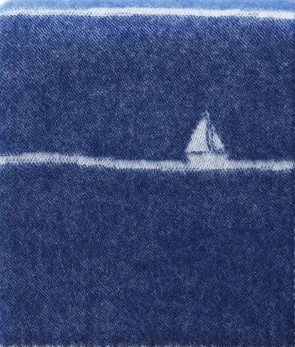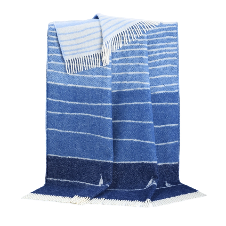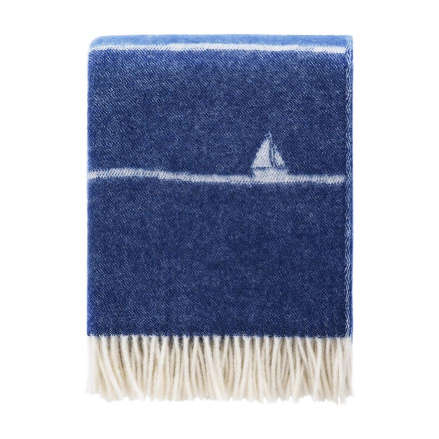 Vacker ullpläd i fint mönster, blått hav, i olika toner och små segelbåtar. Varm och skön ullpläd som både andas och värmer och fungerar perfekt att använda året runt.