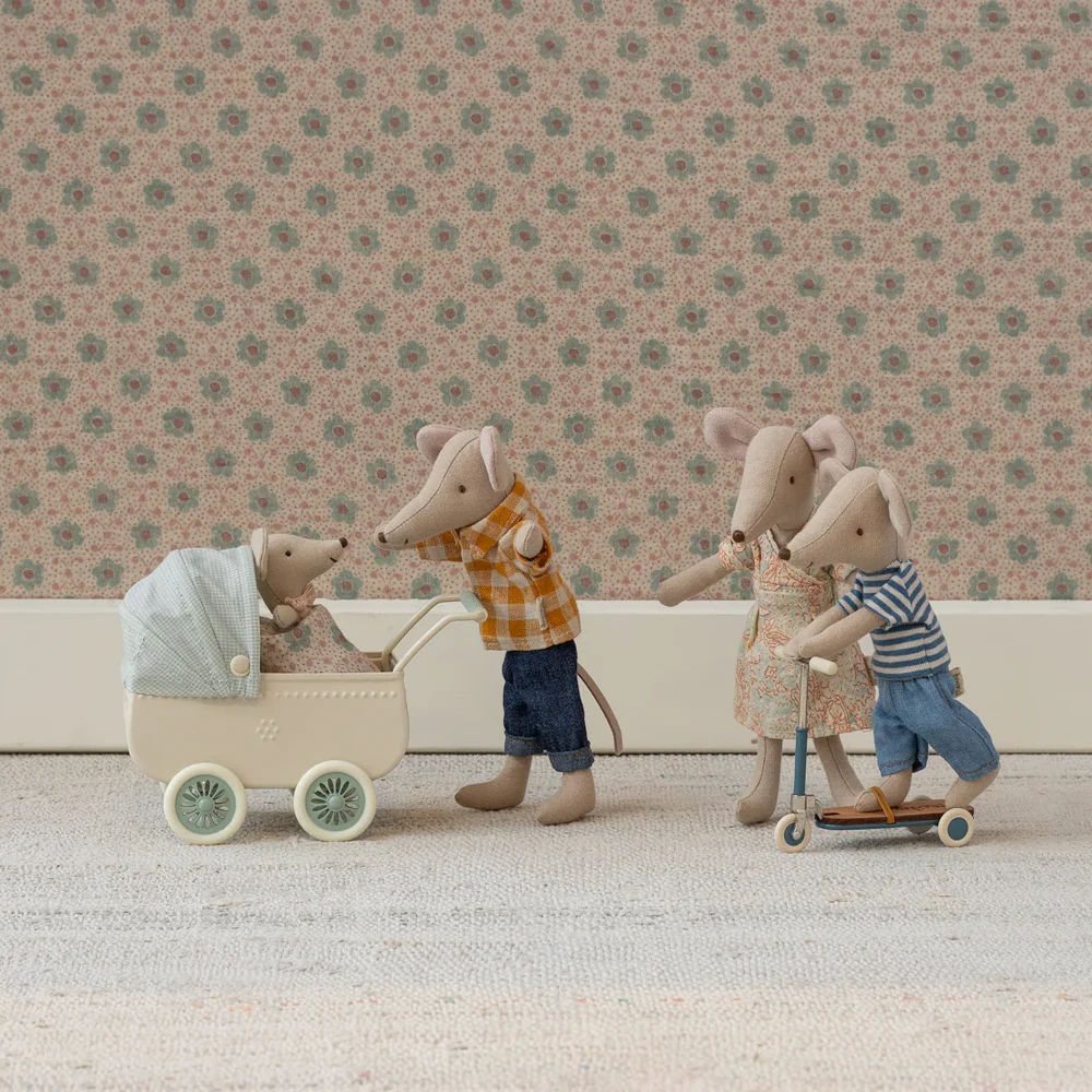 Fin retrobarnvagn med babymus. Den lilla Baby-musen ligger bekvämt i sin sovsäck på en mjuk madrass i den charmiga vintagebarnvagnen – redo att sova gott i timmar.  Denna miniatyrvagn blir en älskad del av mössens vardag och en fin inredningsdetalj i Maileg-världen. Perfekt för kreativ lek, samling eller som en underbar present. Krämvitvagn med mintfärgade detaljer och sufflett.