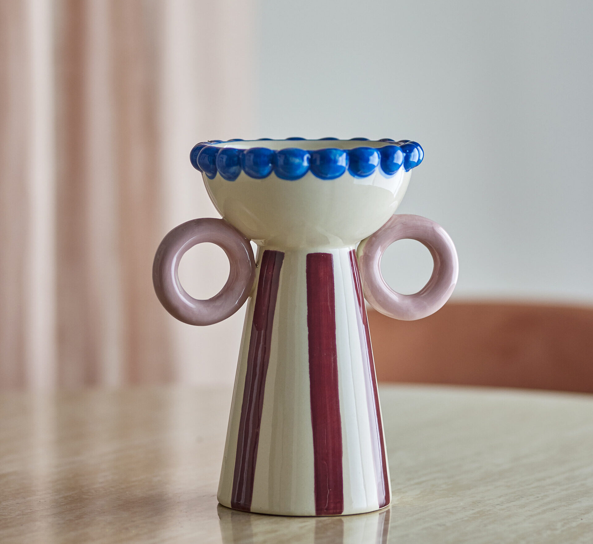 Upptäck den vändbara vasen Hyldia från Bloomingville – en unik inredningsdetalj i handmålat stengods som kombinerar djärva former med mjuka färgtoner. Med sina karakteristiska rosa handtag och randiga mönster blir den snabbt ett blickfång på bordet eller i fönstret. Eftersom varje vas är målad för hand får du ett helt unikt hantverk som ger ditt hem en personlig och konstnärlig känsla. vasen är vändbar, så du kan antingen använda den för snittblommor i den djupa delen, eller tex ha små blommor eller låta några blommor flyta i den grunda delen.